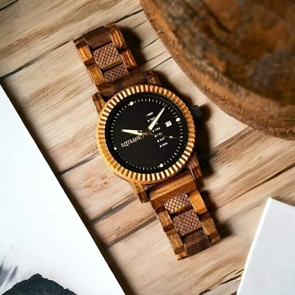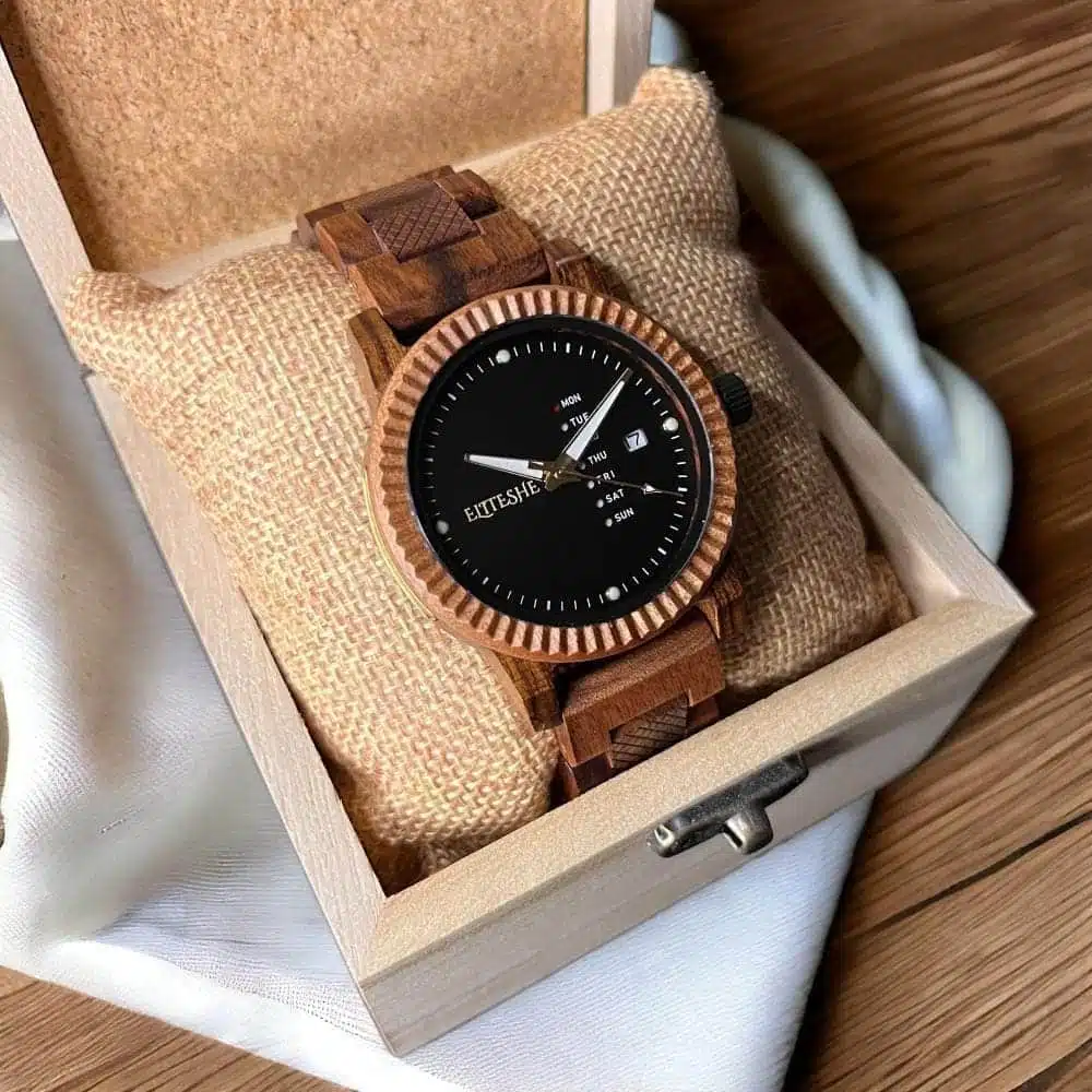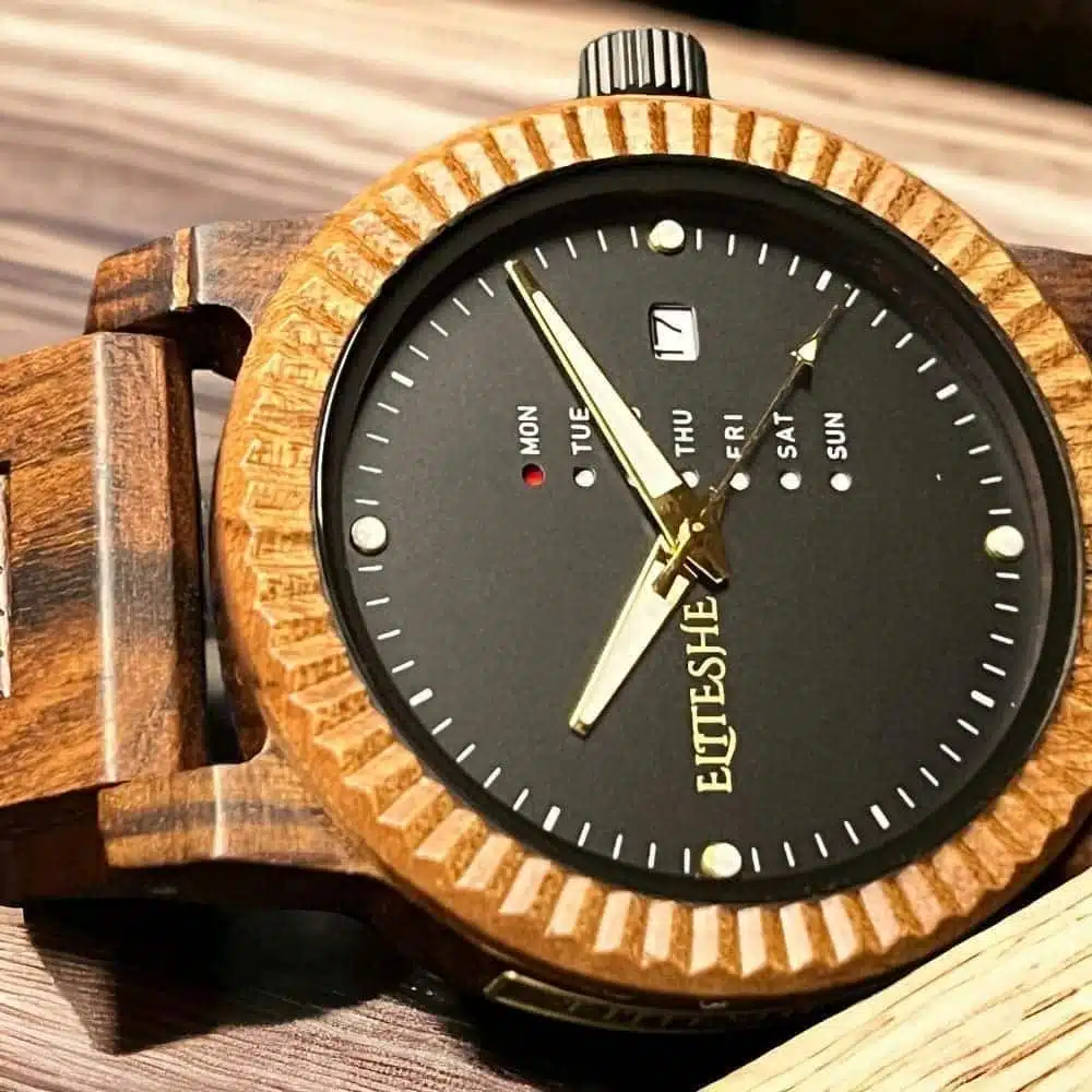 ساعة بلاك فولكانو الخشبية تتميز هذه الساعة بمحرك كوارتز ياباني الصنع فاخر وانيق مع خاصية التاريخ بأيام الأسبوع والزجاج الياقوتي المقاوم للخدش وحزام الساعة الخشبي بالكامل . هذه الساعة مصنوعة يدويًا بدقة متناهية من خشب الزيبرا والأبانوس الطبيعي الإستوائي