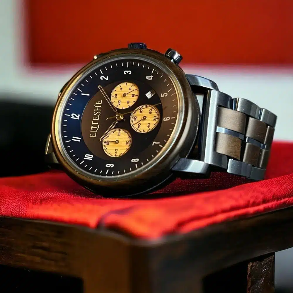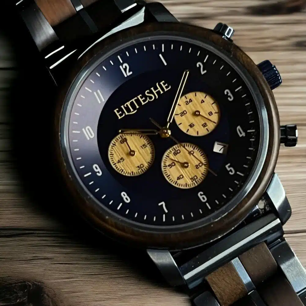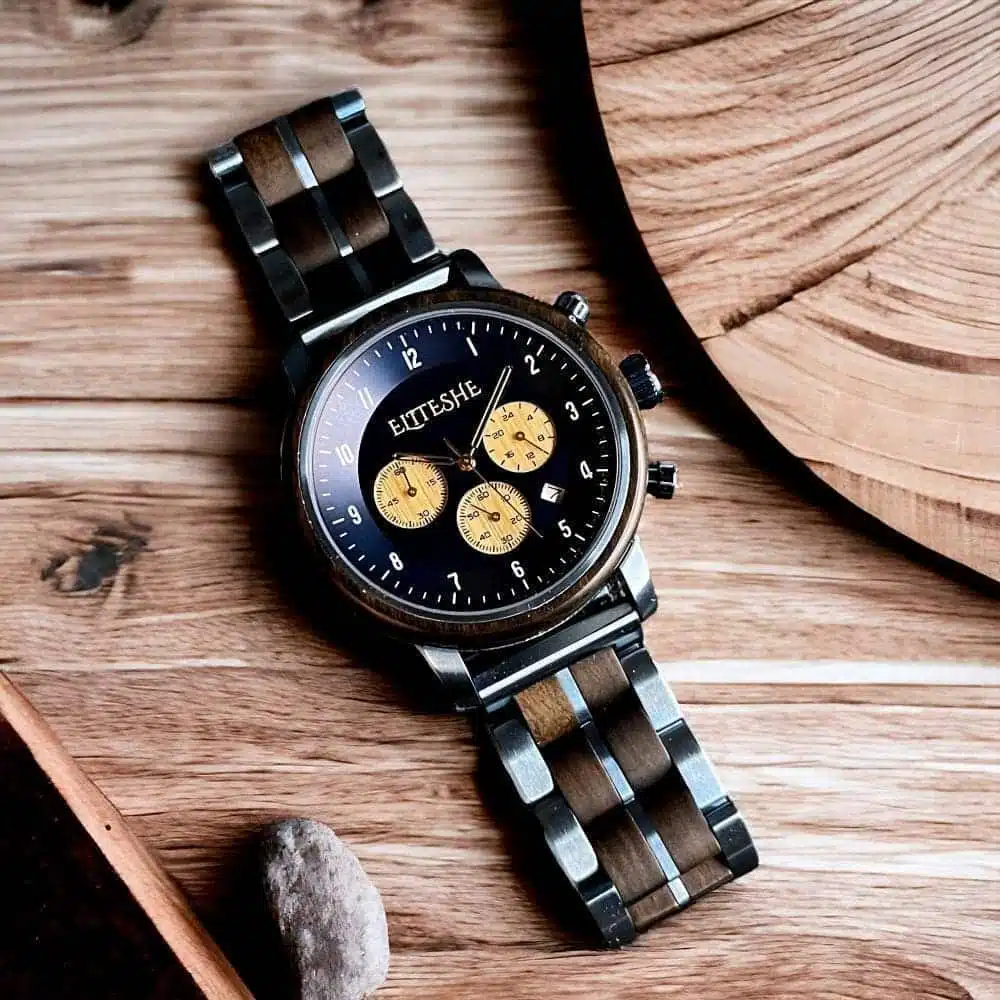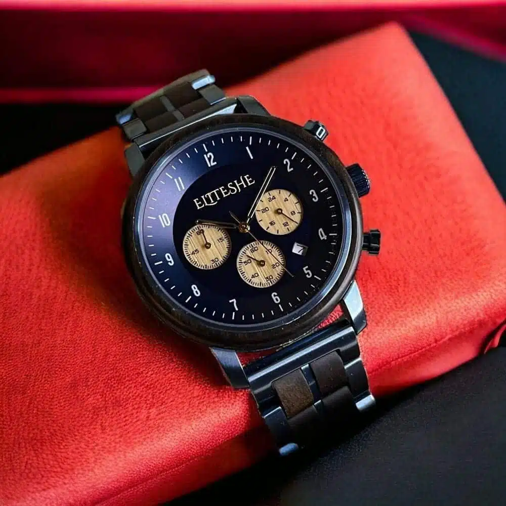 تتميز ساعة بلو ديزارت بتصميمها الفريد من نوعه، حيث تجمع بين الإستيل وخشب الأبانوس الطبيعي. يعطي الإستيل للساعة مظهرًا أنيقًا ومتينًا، بينما يضيف خشب الأبانوس الطبيعي لمسة من الدفء والفخامة.