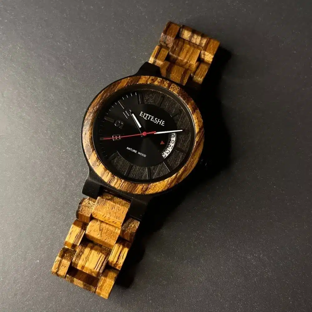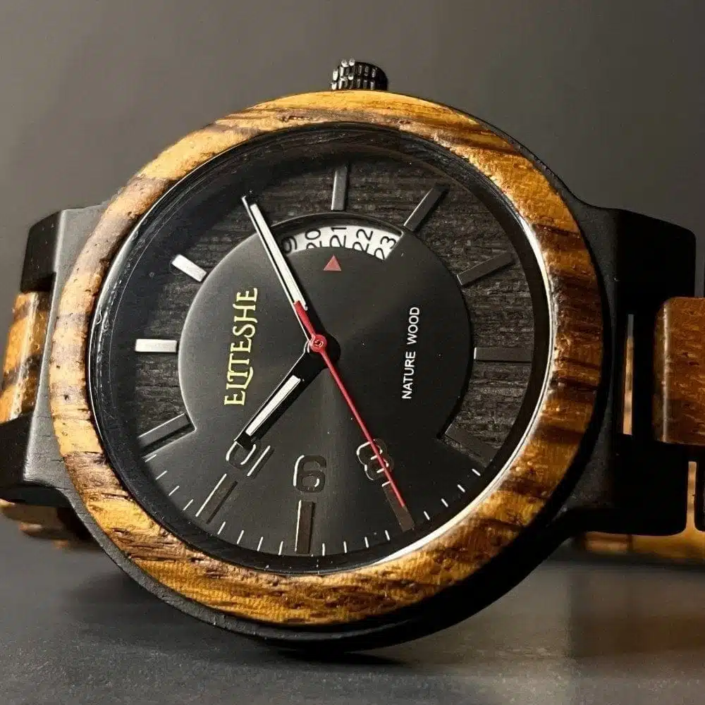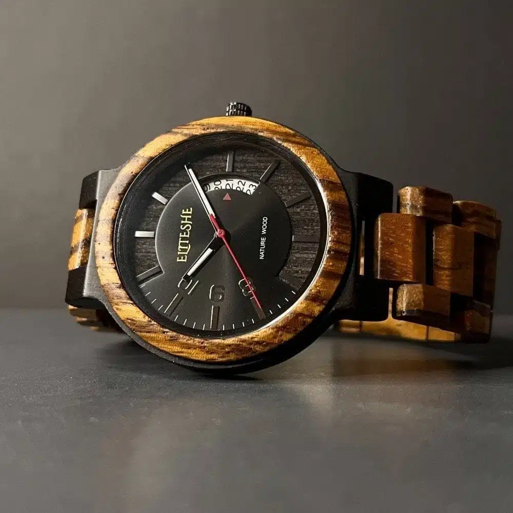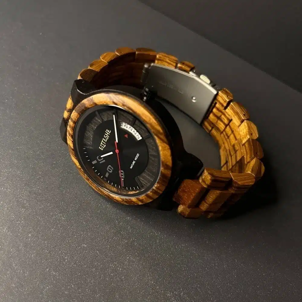 ساعة دارك ستروم الخشبية مصنوعة باليد من مزيج فريد من الخشب الطبيعي المقاوم للماء والذي يتميز بتفاصيل أنيقة تجعل حياتك اليومية في منتهى الاناقة والفخامة ، وتأتي بمحرك كوارتز ياباني الصنع مقاوم للماء ، وهي بسماكة 11 mm ومقاس للقرص 44 mm , احصل عليها اليوم !
