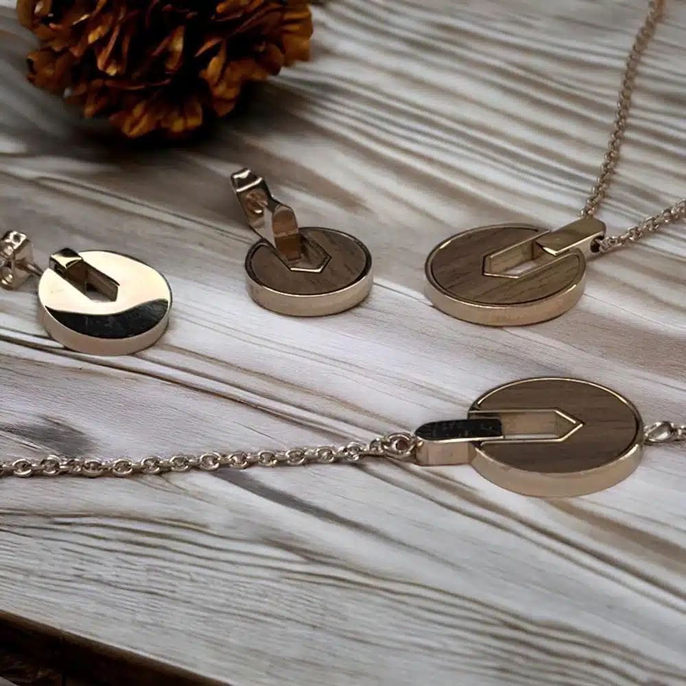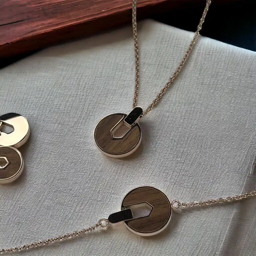 مصنوعة من خشب الجوز الطبيعي مع الاستيل المقاوم للماء والصدأ والمطلي بالذهب ليضفي على روز قولد هاف مون بريق ولمعان وأناقة .
