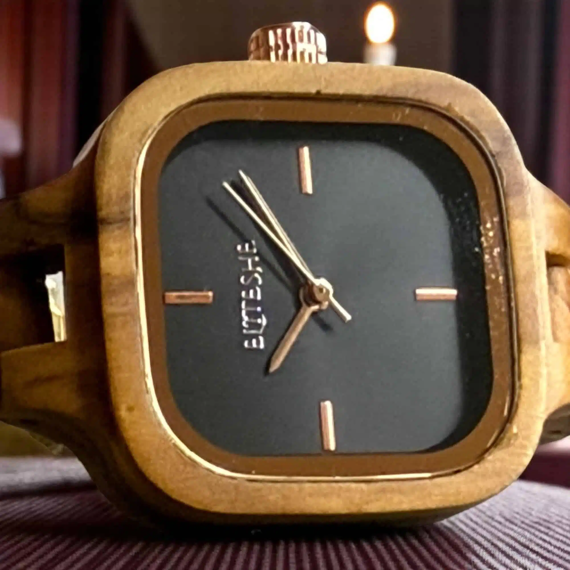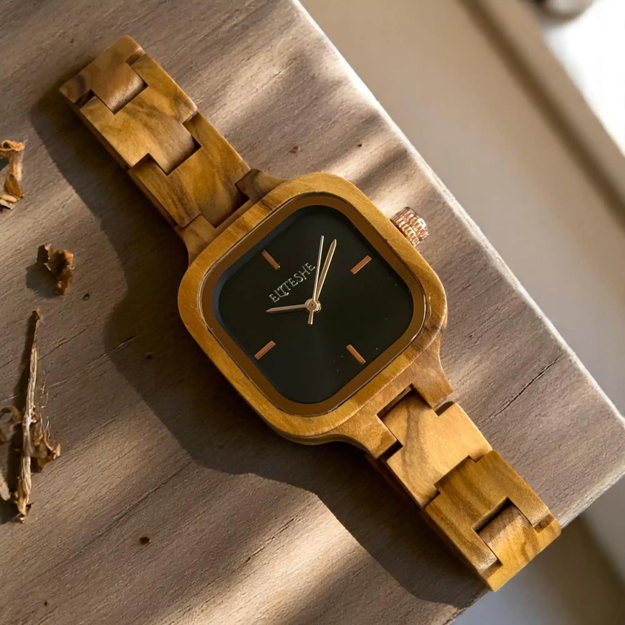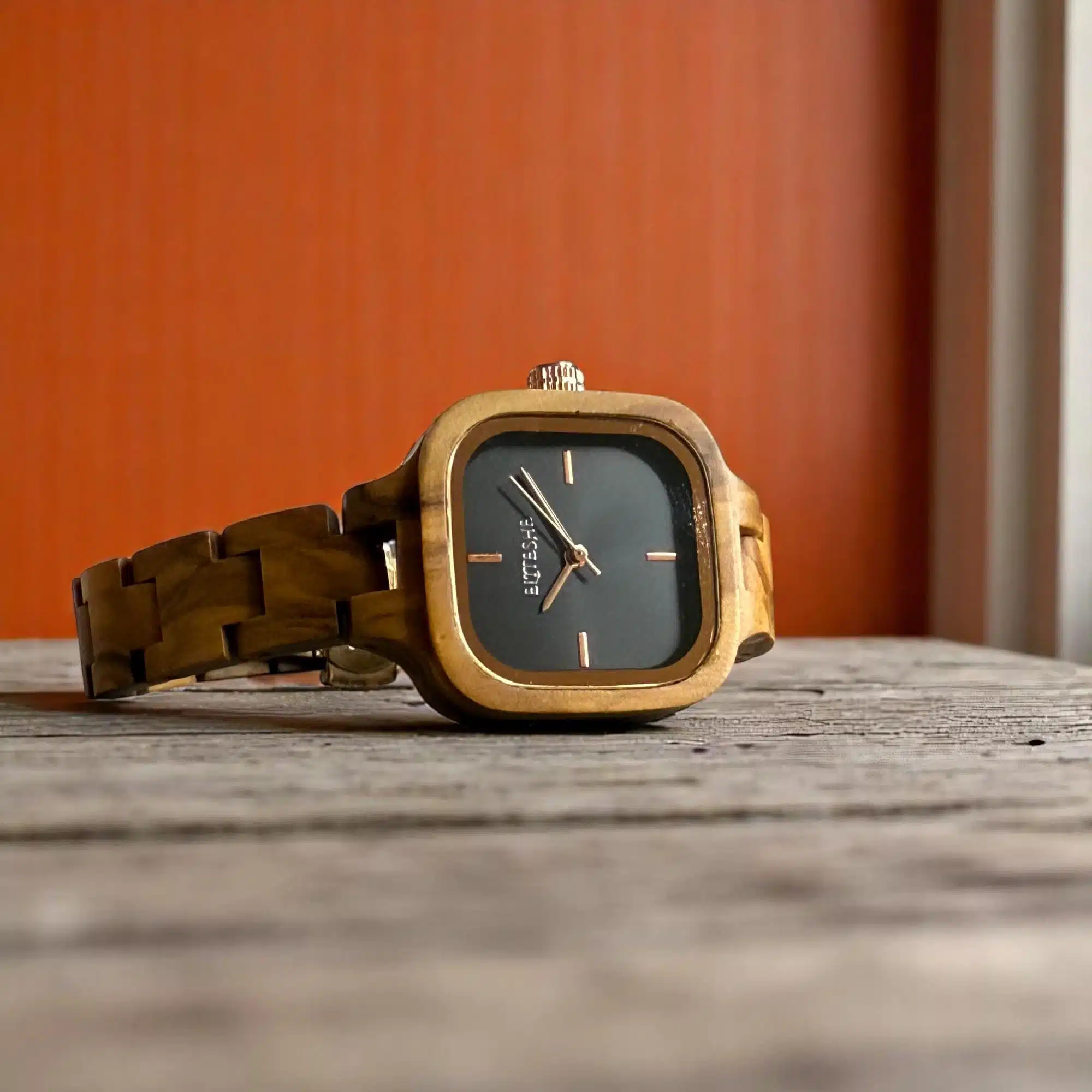 ساعة أوليف نوتيكا وود النسائية تحفة فريدة مصنوعة من خشب الزيتون الطبيعي، تجمع بين جمال الطبيعة ودقة الساعات الفاخرة. تتميز بتصميم مربع أنيق بوجه أسود مطعم بالذهب، وحزام خشب زيتون طبيعي مريح.