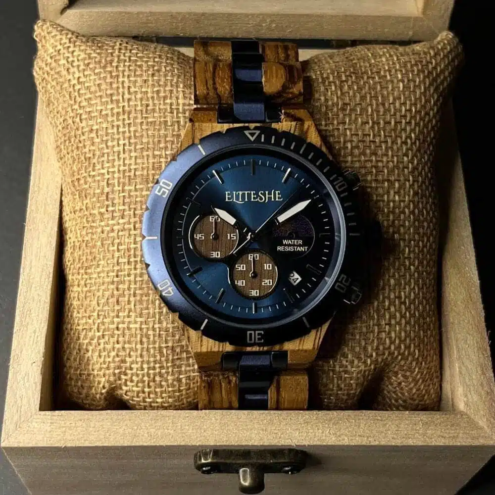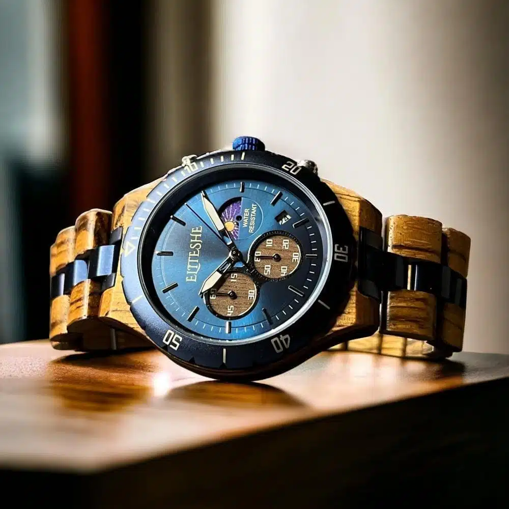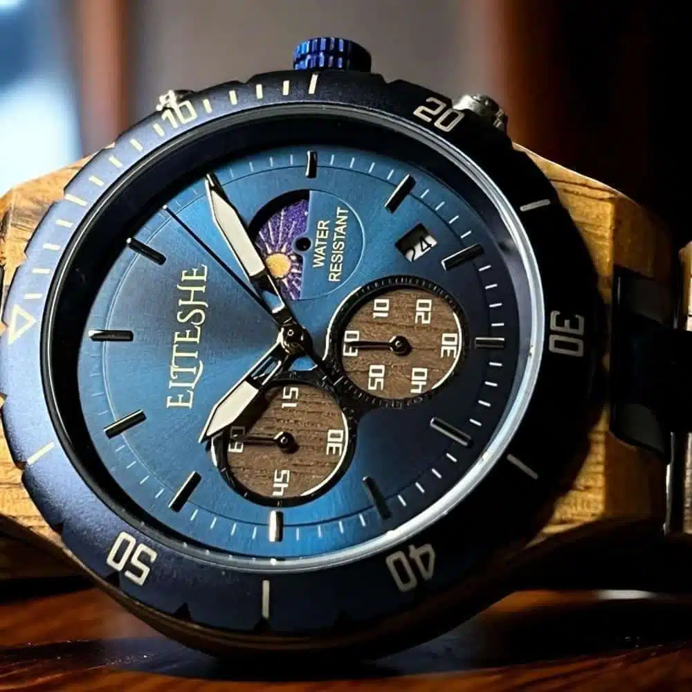 🌊 ساعة بلو ليجيند مون الخشبية – أناقة بحرية بتقنية كرونوغراف فاخرة!