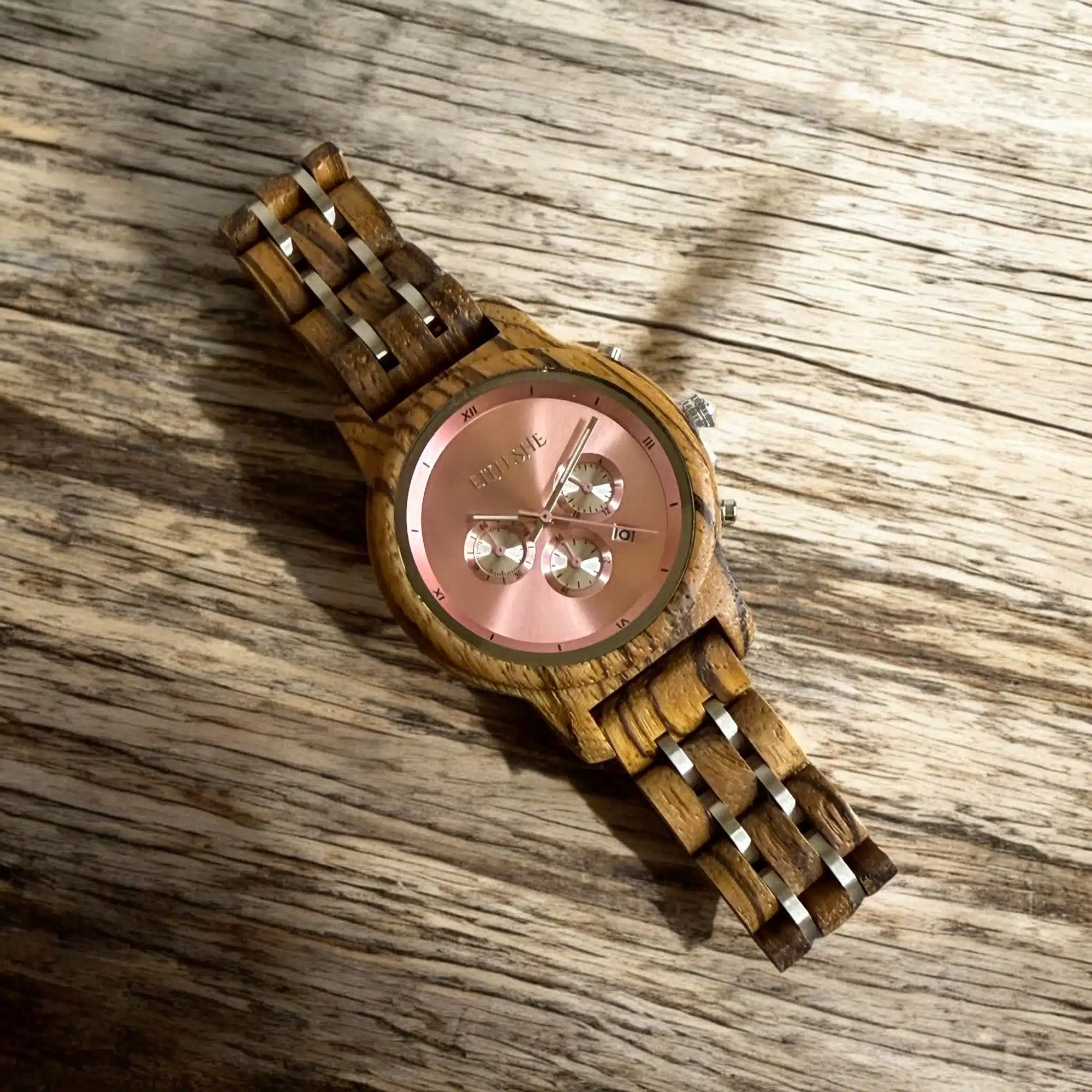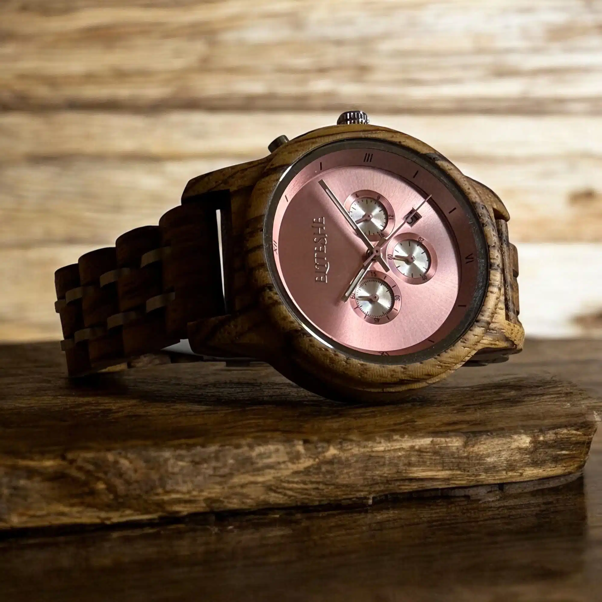 💖 ساعة بينك كرونو الخشبية – رومانسية الطبيعة على معصمك!