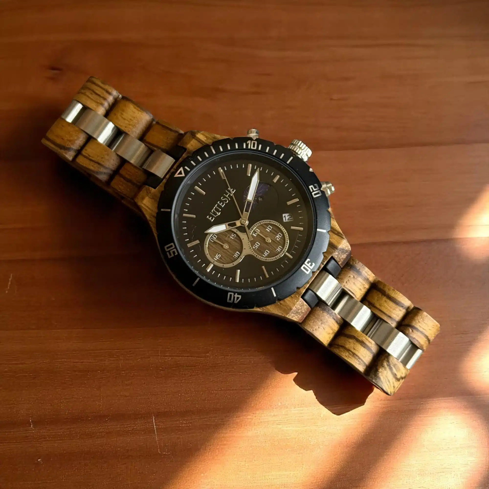 ساعة دارك ليجيند مون الخشبية الرجالية هي مزيج مثالي بين فخامة الخشب الطبيعي وأداء الكرونوغراف الدقيق. مصنوعة بكاملها من خشب طبيعي بلمسة نهائية خشبية كلاسيكية، مع وجه أسود ستيل أنيق يتوسطه مربع التاريخ وعقارب ليلية ونهارية.