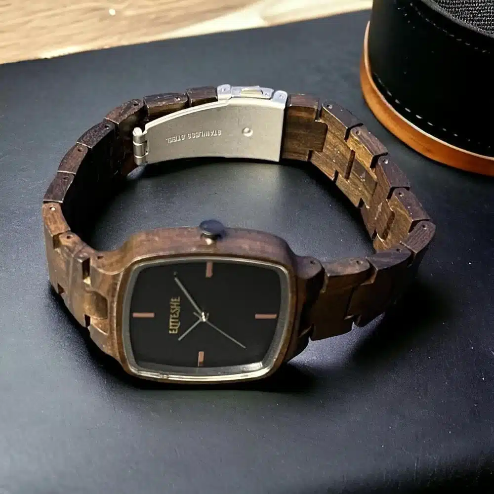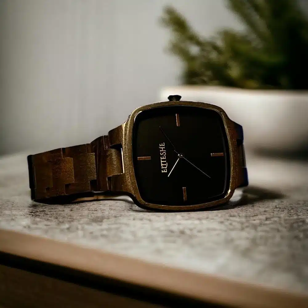 ساعة كلاسيك سكوير الرجالية تحفة فريدة من خشب الجوز الطبيعي، تتميز بتصميمها المربع الأنيق والمقاس المثالي 38مم. وجه أسود كلاسيكي مع تفاصيل خشبية طبيعية، تمنحك إطلالة مميزة تجمع بين الأصالة والحداثة.