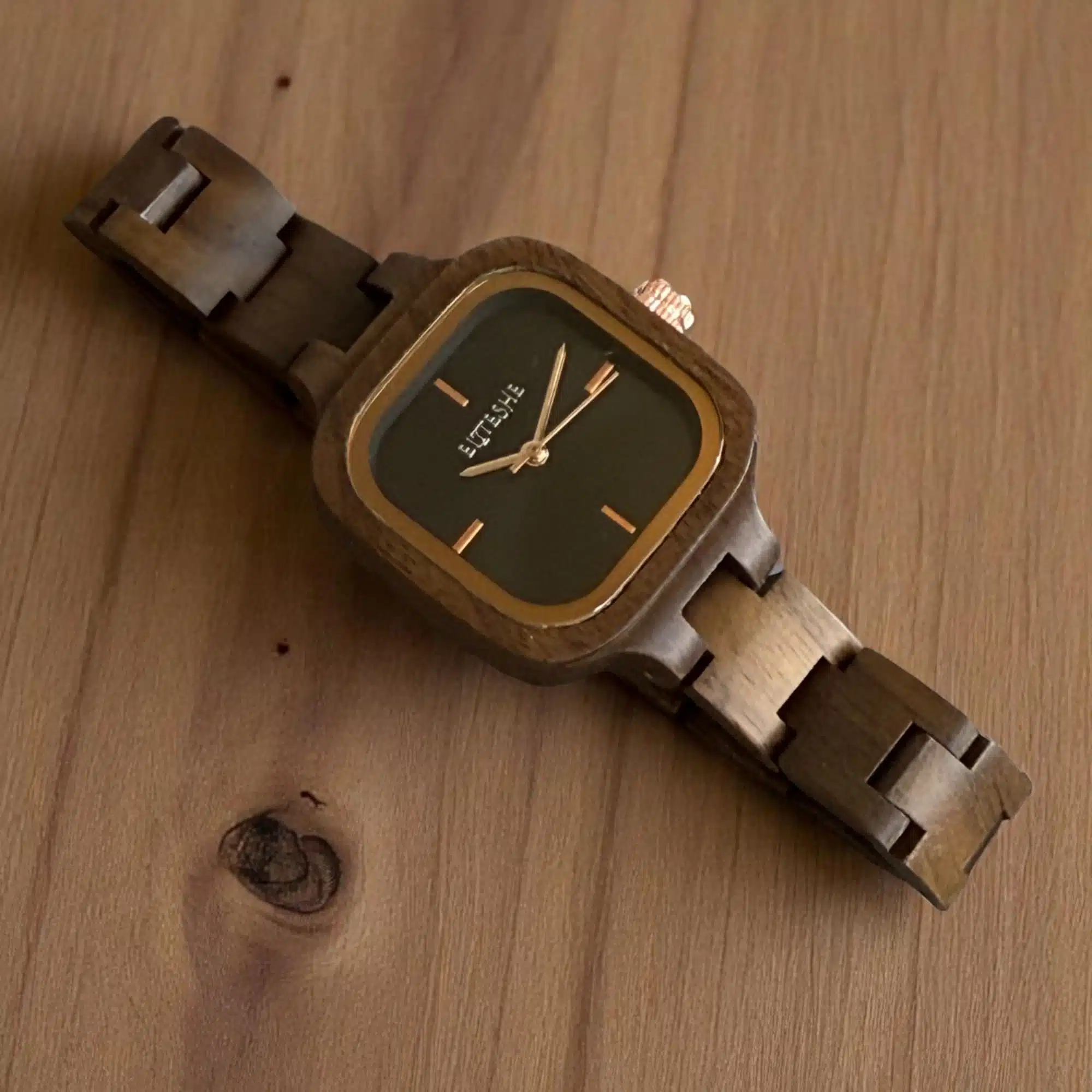 ساعة والنت نوتيكا وود النسائية تحفة فريدة من خشب الجوز الطبيعي، تجمع بين دفء الأخشاب الفاخرة وأناقة التصميم العصري. تتميز بتصميم مربع أنيق بوجه أسود مطعم بالذهب، وحزام من خشب الجوز الطبيعي المريح.